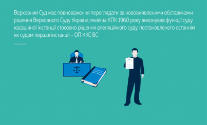 Відповідно до вимог п. 21 ч. 1 ст. 3, ч. 3 ст. 33 КПК України Верховний Суд наділений повноваженнями щодо перегляду за нововиявленими обставинами рішення Верховного Суду України, який за КПК України 1960 року виконував функції суду касаційної інстанції стосовно рішення апеляційного суду, постановленого останнім як судом першої інстанції.