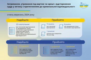 Протягом трьох кварталів 2024 року до ВРП надійшло 2 подання про надання згоди на утримання судді під вартою, за результатами розгляду яких Радою прийнято 1 рішення про надання згоди на утримання під вартою судді та 1 рішення про повернення подання про надання згоди на утримання під вартою у зв’язку з невідповідністю вимогам закону України «Про Вищу раду правосуддя».