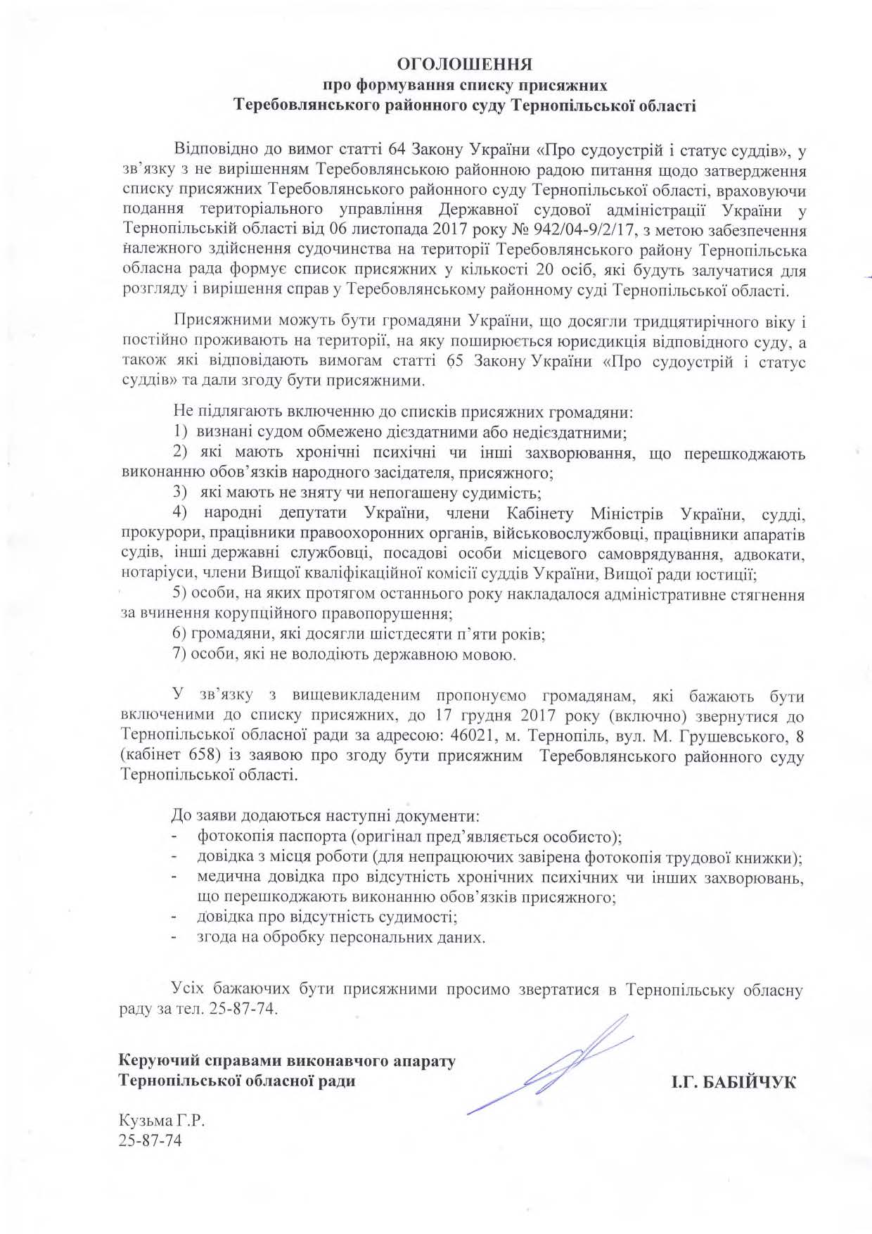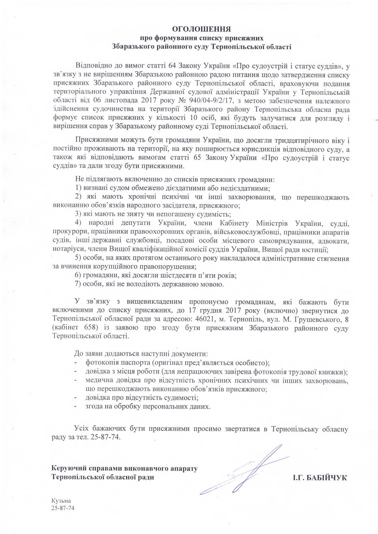 Тернопільська обласна рада оприлюднила оголошення про формування списку присяжних Збаразького районного суду, оголошення про формування списку присяжних Кременецького районного суду та оголошення про формування списку присяжних Теребовлянського районного суду.