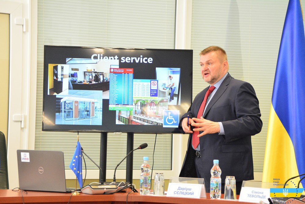 Зокрема, експерт Проекту Даріуш Сєліцкий презентував бачення реалізації одного зі складових компонентів Проекту, що полягає в обранні декількох судів в Україні, на базі яких будуть створені модельні суди («The Model court of the Ukrainian Judiciary»).