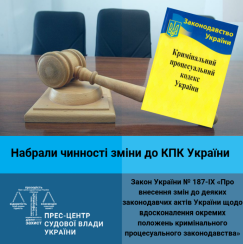 16 жовтня 2019 року в газеті "Голос України" оприлюднено Закон України № 187-ІХ «Про внесення змін до деяких законодавчих актів України щодо вдосконалення окремих положень кримінального процесуального законодавства». Відповідно до розділу II "Прикінцеві положення" цей Закон набирає чинності з дня, наступного за днем його опублікування.