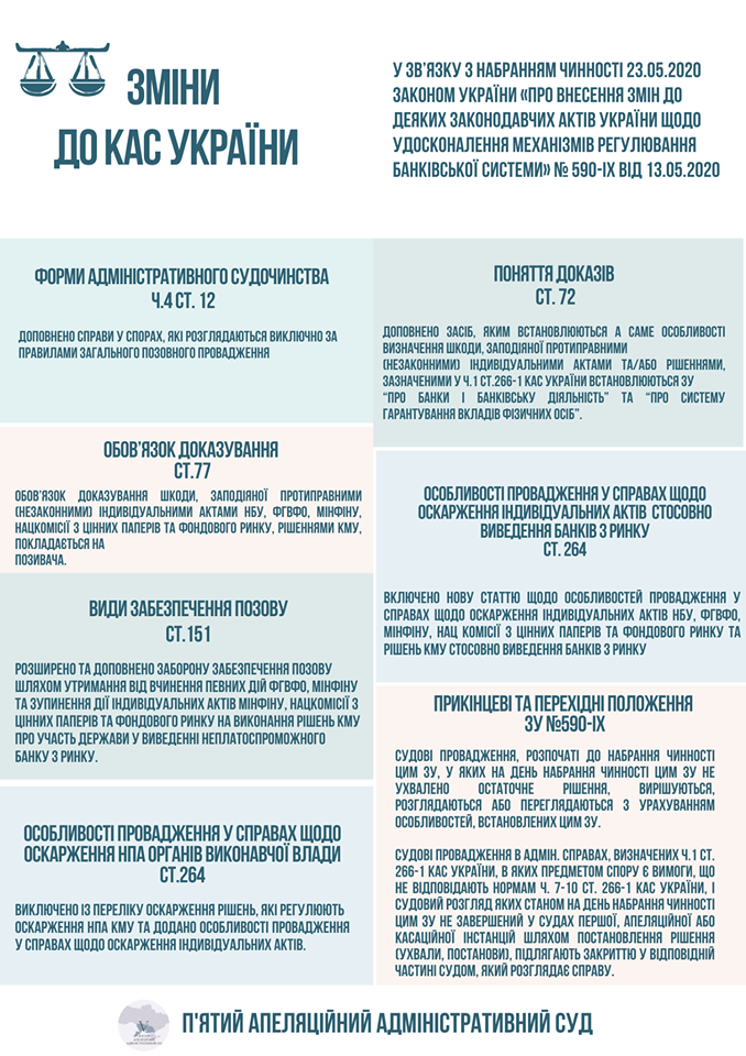 Внесено зміни до Кодексу адміністративного судочинства України у зв’язку з набранням чинності 23.05.2020 Законом України «Про внесення змін до деяких законодавчих актів України щодо удосконалення механізмів регулювання банківської системи» .№ 590-ІХ від 13.05.2020.